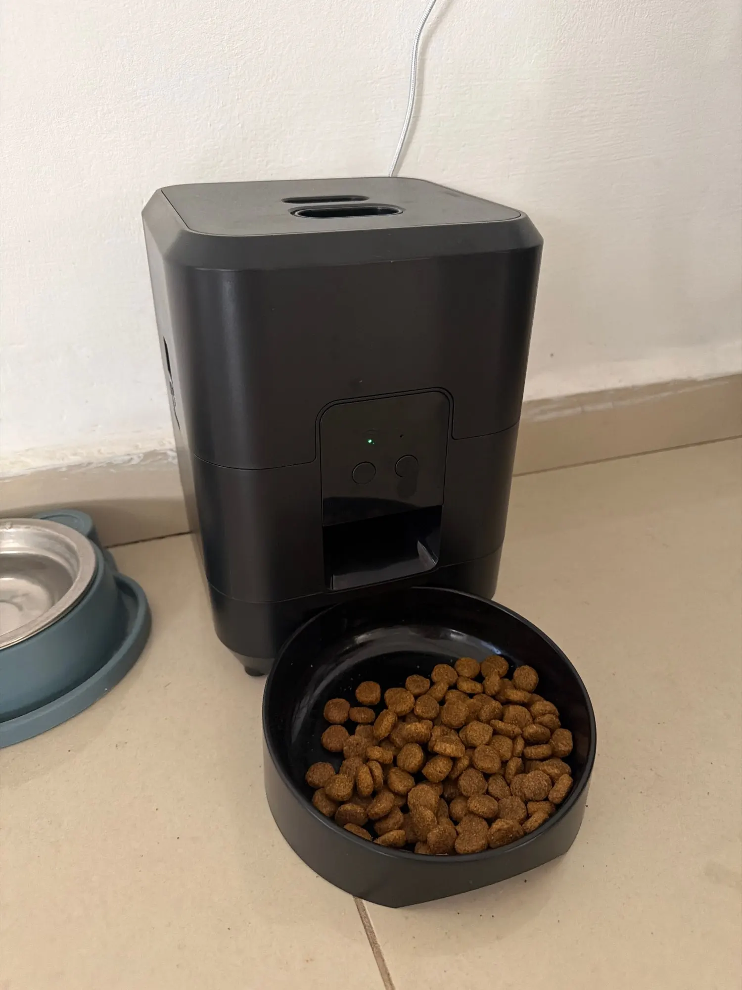 Definitely buy the wifi model! It connects well with the app and the timing is accurate! It's smaller than I expected, so it might fit a bit in the storage box, which holds about 1kg. I use Royal Canin Indoor 7+ food, and it dispenses about 7-8g at a time.